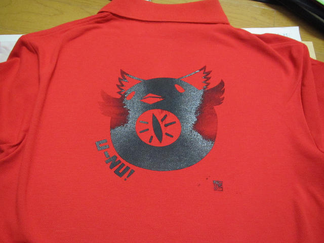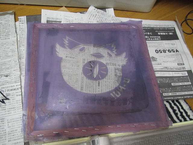 ・裏に糊が張り付いている ・図柄の抜けが悪く、まだらになる ・感光部分が剥がれる ・スクリーン増強剤を吹くと目詰まりして印刷時にかすれる 原因 ・スプレーのりの乾燥時間不足。 ・水洗いで漬けた際版に圧力がかかると感光部分が剥がれる可能性がある ・増強剤噴射による抜き部分への目詰りはマルチチョイスインク用のうすめ液で表面より拭う ・解決には慣れと経験が必要 シルクスクリーンによる初印刷 ・写りが薄い 原因 ・起毛が大きいとインクがのりにくい ・近所の商店とかでもらえるようなタオルは起毛の無い部分に印刷している シャツへの印刷1枚目 ・全体に写りが薄い ・上端両端と右上の写りが悪い ・左上が若干薄い 原因 ・スキージへかける力が弱すぎた、あるいはインクの上でスキージが滑って力が伝わらななかった ・シャツを貼りつけた板が凸に大きく湾曲していた シャツへの印刷二枚目 ・二度刷りした所色は十分な濃さ ・左右両端の写りが非常に悪い ・落款周辺にインクの飛び写りがある 原因 ・シャツを貼った1mm厚のプラ板が大きく凸状に湾曲していた ・落款の近くにピンホールがあった 次回の改善点 ・シャツに使用する板を厚めのMDF板に変更する ・シャツへの印刷前に新聞紙で空摺りをする ・印刷枚数を多くとることでインクの無駄を減らす(前提:印刷の安定) 本日の損失 ジャスコ投げ売りシャツ2枚(¥1000) ダイソーハンドタオル(¥105) Tシャツくんミドルスクリーン1枚と4分の1(¥875) OHPシート2枚(¥200) ダイソーコルクボード(小)(¥105) ダイソーフォトフレーム(¥105) 計¥2400 PR |