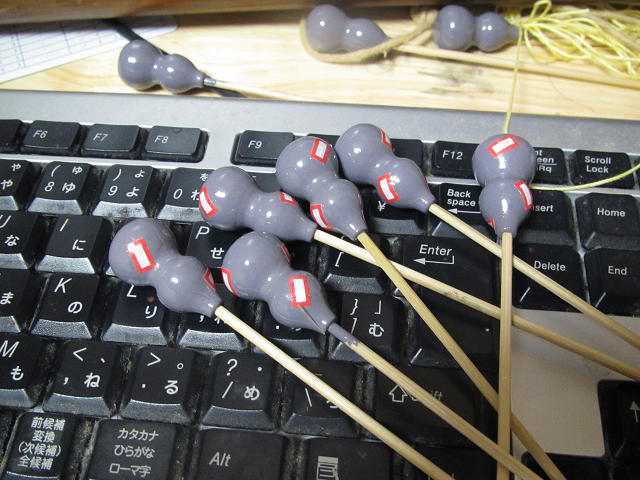 こいつは渋抜きまでの処理が必要ないので瓢箪に比べて加工が楽なんだけれども、小さいため札を貼るのに難儀しました。なんとか18個用意。
